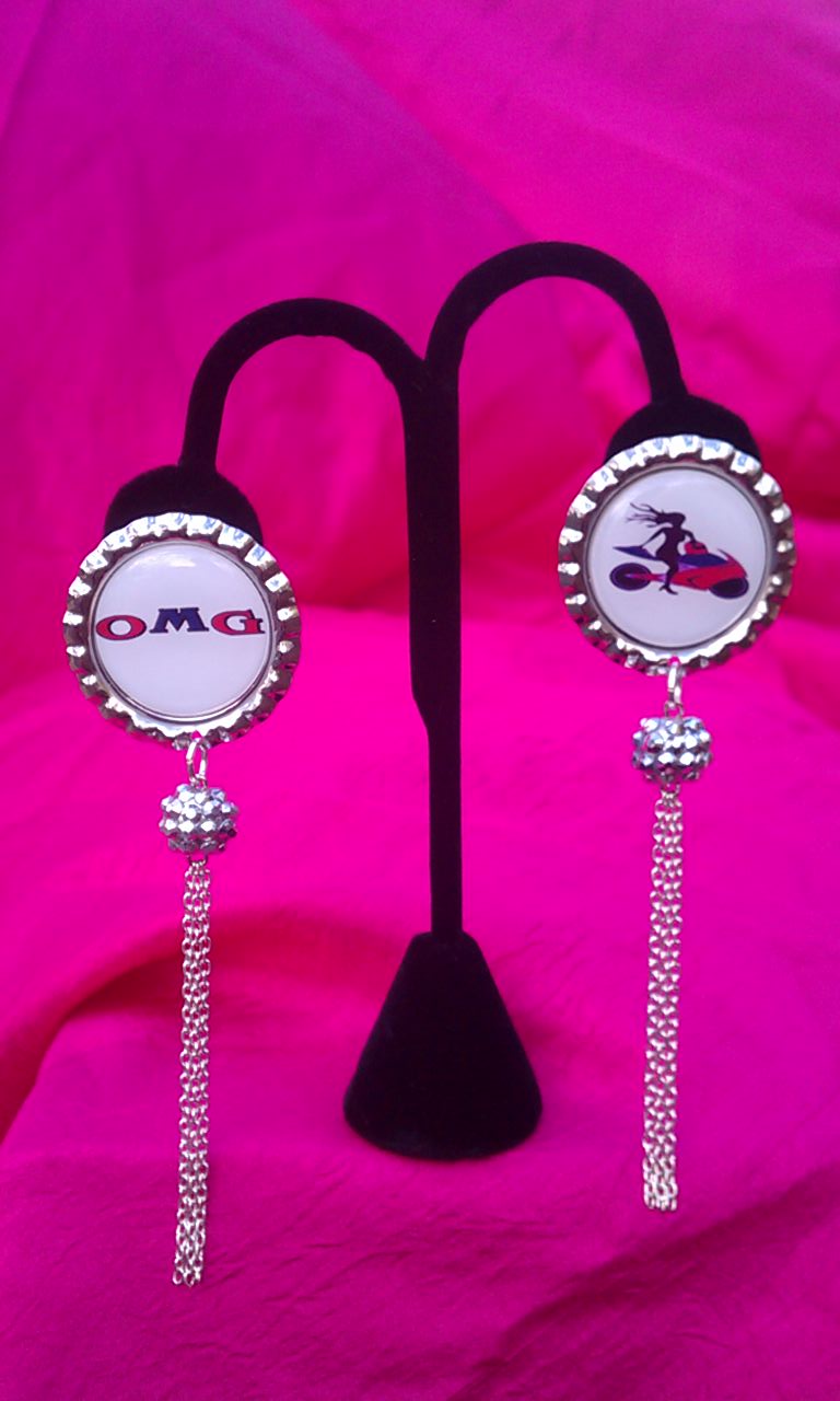 Handcrafted bottlecap earrings & other accessories to express your company logo, hobby, social awareness or even a fave sports team. Have a custom 'cap' in mind? Contact me! Caps are 1" & are brand new. Epoxy dome covered image creates dimension.
