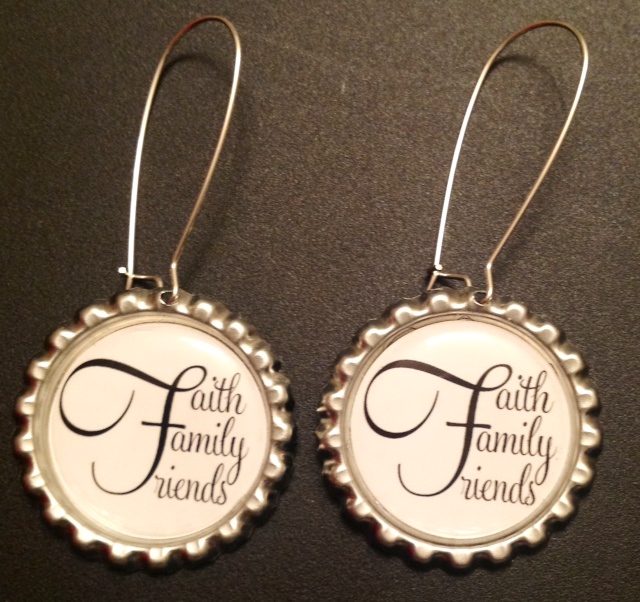 Shiny chrome bottle cap on kidney ear wire. Black on white Faith, Family, Friends image protected by epoxy resin which gives a glossy, 3D look.